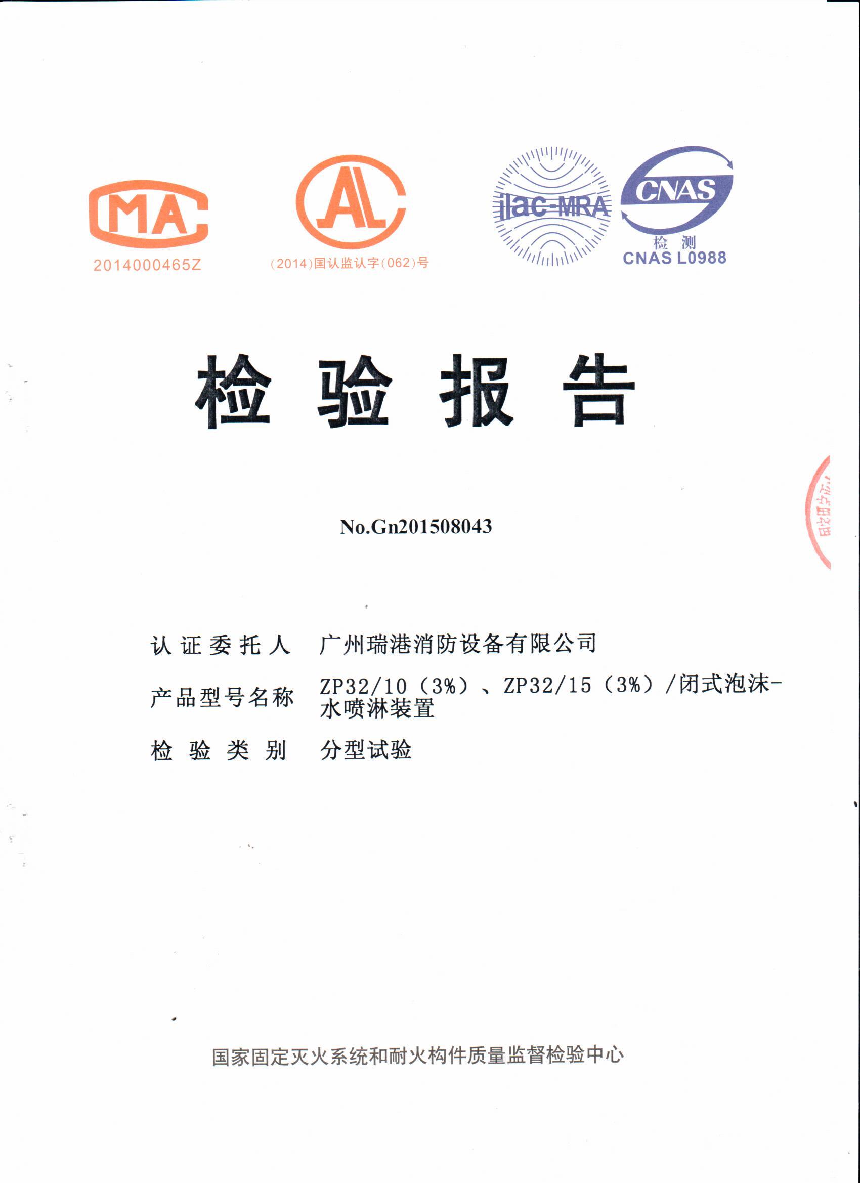 ZP32/10閉式泡沫-水噴淋裝置檢驗(yàn)報(bào)告